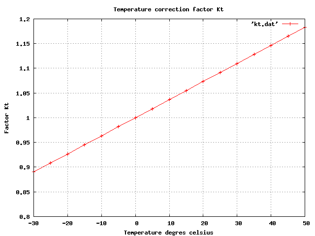 ![]() | T(ºC) Kt -30 0.890110 -25 0.908425 -20 0.926740 -15 0.945055 -10 0.963370 -5 0.981685 0 1.000000 5 1.018315 10 1.036630 15 1.054945 20 1.073260 25 1.091575 30 1.109890 35 1.128205 40 1.146520 45 1.164835 50 1.183150 |